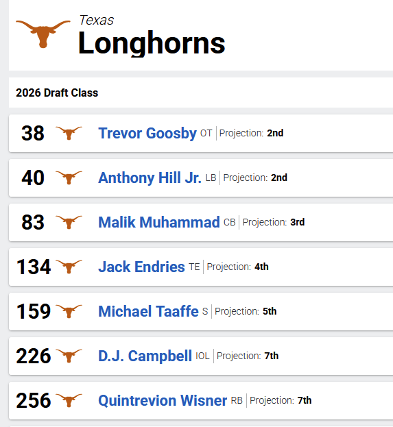 Mock consensus has him # 83, 3rd round, 3rd Longhorn taken. This will change somewhat after the combine and after all the 3rd year guys decide on whether to enter or not. Last year the final mock was a little over-optimistic on the Horns, nailing all but one of their picks but on average rating them to go a little higher than they finally did, so take it for what it is, an early snapshot. Hopefully three of these guys come back, right? -