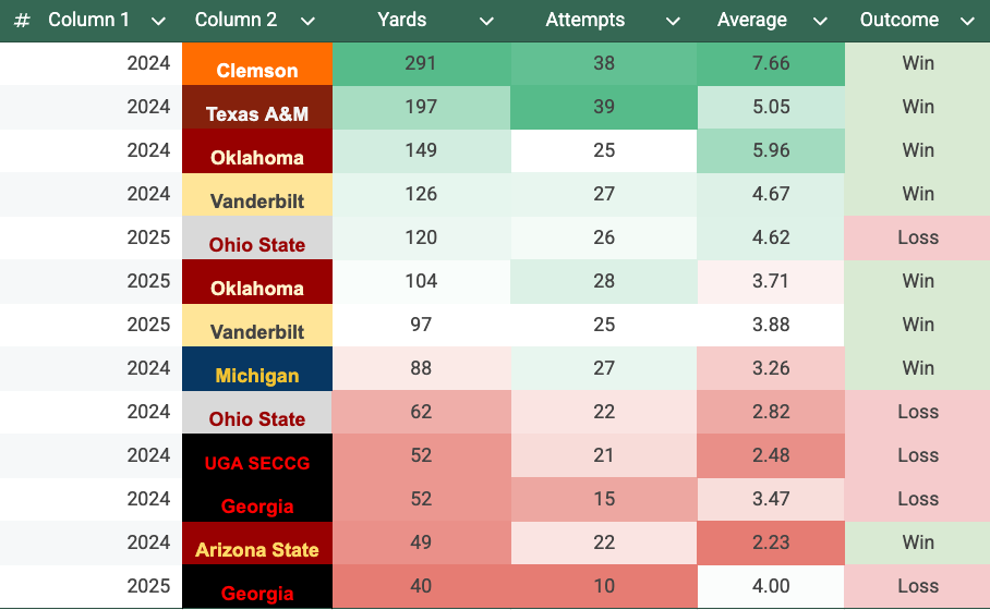 A few eye-opening rushing statistics *** Very clearly a main topic of discussion given how this season has gone, but I wanted to set an idea for where things are in the running game currently. Texas rushing stats vs. ranked opponents since the beginning of 2024. Texas has played 13 ranked teams in that time span. Only three times out of the 13 games has Texas averaged 5.0 yards or more. Is that personnel? Is that scheme? Is that the inability or unwillingness to stick with the run before it can figure itself out? I'm not sure. I would bet all of the above. *** Rushing Numbers from SEC Teams in Conference Games 207.0 - Missouri 205.3 - Texas A&M 201.0 - Arkansas 184.3 - Georgia 171.9 - Ole Miss 146.8 - Vanderbilt 138.8 - Tennessee 138.1 - Auburn 131.4 - Kentucky 121.7 - Miss State 115.9 - Florida 108.8 - Oklahoma 102.3 - Alabama 99.0 - LSU 98.0 - South Carolina 71.7 - Texas Texas also has the second fewest amount of rushing attempts per game in conference play at 27.5. Only LSU, at 26.8, has fewer rushing attempts in conference games. Additionally, Texas is dead last in yards per rush in SEC play. Longhorns are averaging only 2.61 yards per attempt in conference play. *** The 1,000-yard rushing streak that has been a feather in the cap of Steve Sarkisian's since becoming a playcaller is more likely than not coming to an end. Leading rusher Quintrevion Wisner has just 375 rush yards this season. -