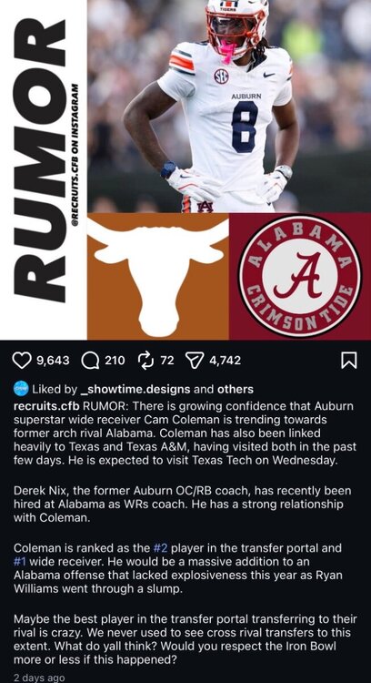 4. Bobby didn’t you talk about familiarity yesterday morning? Welp, here is your Ace of Spades for Cam-Mania to go right back to sweet home Alabama with a familiar coach. Texas needs to pop that clutch into 5th gear with seeking another WR for Heisman Arch. They need to draw these kids into the portal like everyone else…7 more days to go.