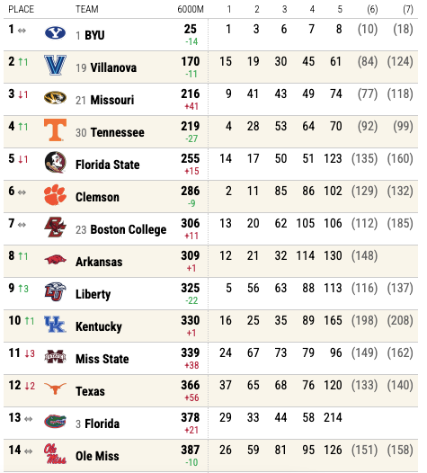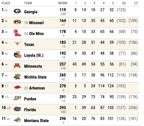Some mixed results for the Cross Country teams who competed in by far their most competitive meet of the year. The women finished 12th overall, behind 5 ranked teams but also 6 unranked teams including Arkansas who they beat head to head 2 weeks ago. They did beat #3 Florida. Overall, I think it is hard to know which teams are running their top runners and what the race strategy is for these teams (ie, are some teams focused on getting a good training day in vs running all out to win a meet) The Men had a less competitive field than the women and finished 4th, with 2 ranked teams finishing ahead of them. They beat #22 Arkansas who they lost to head to head 2 weeks ago. SEC Championships in 2 weeks and regionals 2 weeks after that. I don't think we will know what to expect until it happens. -