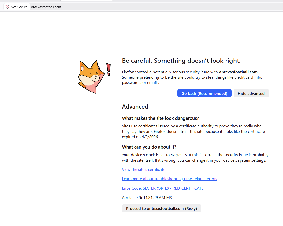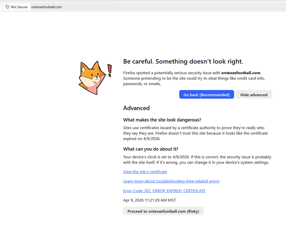 I just renewed my subscription for year 3 yesterday, paying with a credit card. Today when I logged on I got a security warning from my Firefox browser. Seems OTF's "security certificate" expires today (4/9/26) and it would be possible for someone to spoof you and, as the warning below says, steal cc info etc. This should be easy enough for your sys admin to fix by renewing the security certificate. I'm bringing it to your attention because others will likely see it as well (and because I just paid with a credit card yesterday, so being a little careful). People may or may not see the warning, depending on their browser and security settings. Here's a screen grab of the warning - if you want more details let me know.