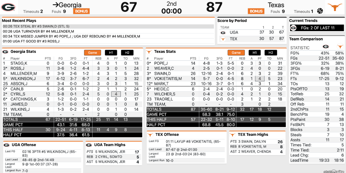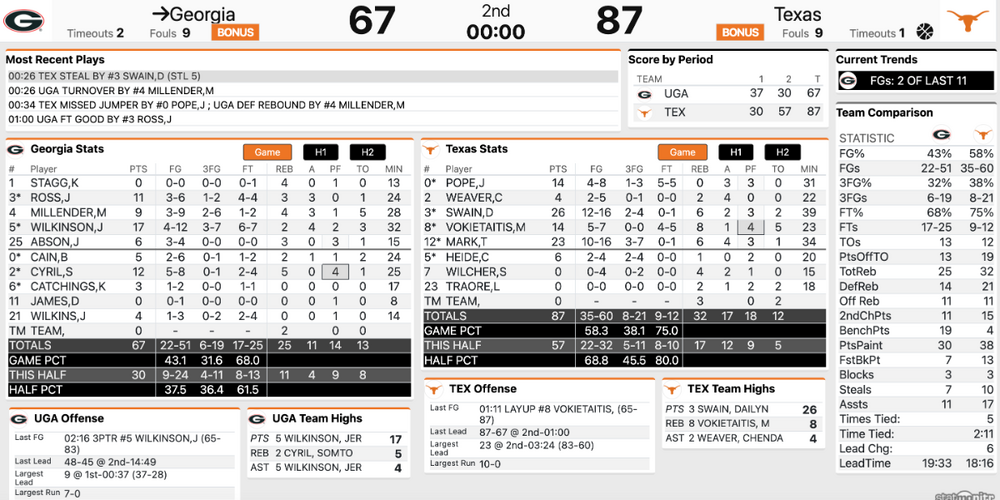 We're waiting for the postgame press conference to start after Texas snapped a two-game losing streak with a blowout win over No. 21 Georgia at Moody Center on Saturday, 87-67. Sean Miller's Longhorns are now 12-8 overall and 3-4 in SEC play. Each of those three wins has come against AP Top 25 opponents.