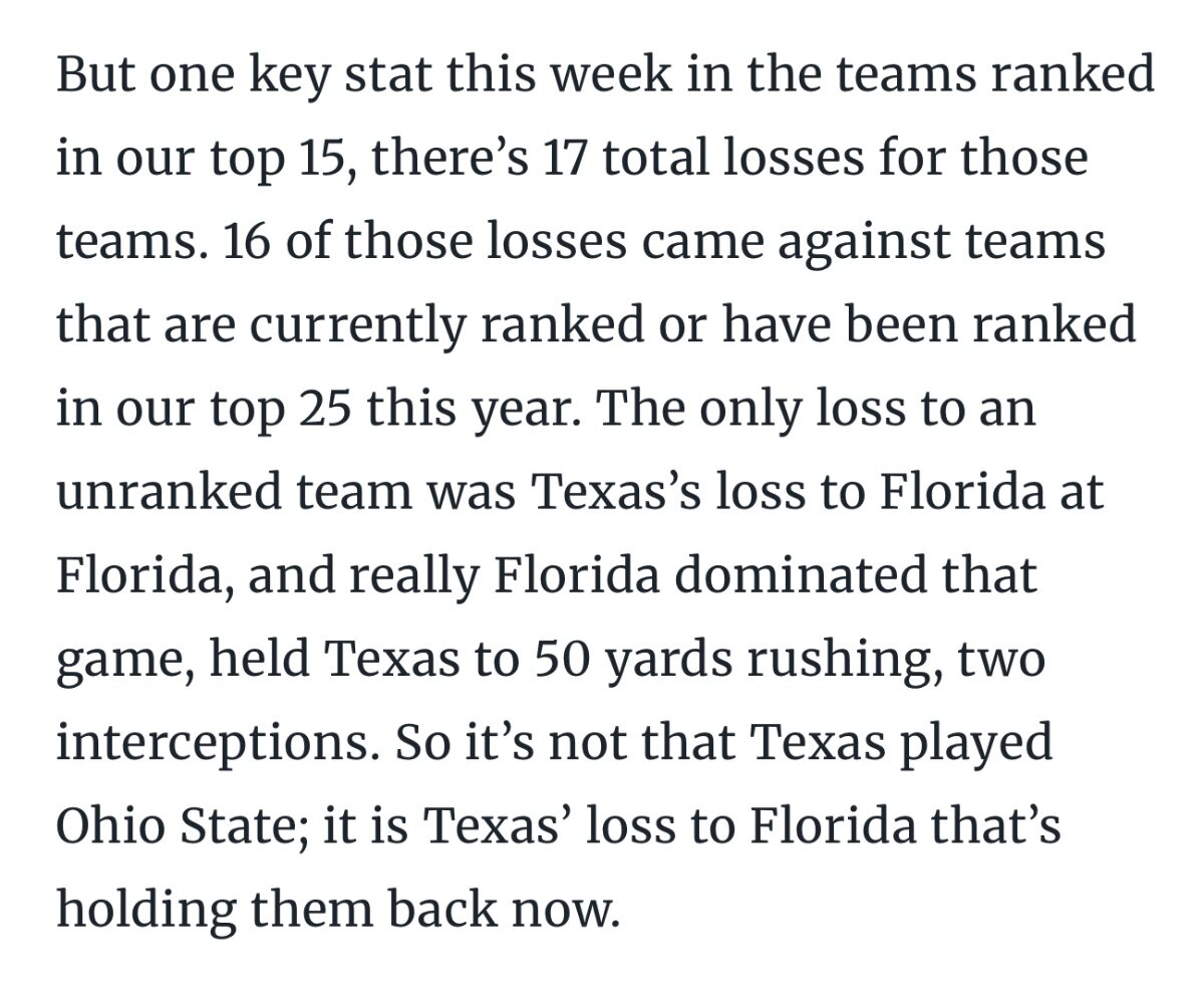 Said Texas was the only team that lost to a team that hadn’t been ranked in the CFP committee’s rankings. And used it as a major justification point for Texas’ exclusion. This is a flat out lie. Bama lost to FSU, that had never been in the committee’s rankings AND was proven on the field to be a worse team than Florida. Yurachek is Arkansas’ AD. No anti-Texas bias there, I’m sure! That nice little tidy statistic is a flat out lie. Texas should honestly demand that Yurachek make a public statement correcting his initial statement to Texas was one of TWO teams that lost to a CFP unranked team. It actually drastically changes the picture. Not saying it gets Texas in, or that Texas should be in. But the CFP chair should NOT!!! be issuing untruthful statements about Texas. And if they are truly misinterpreting and misrepresenting data this badly, those committee members should be replaced.