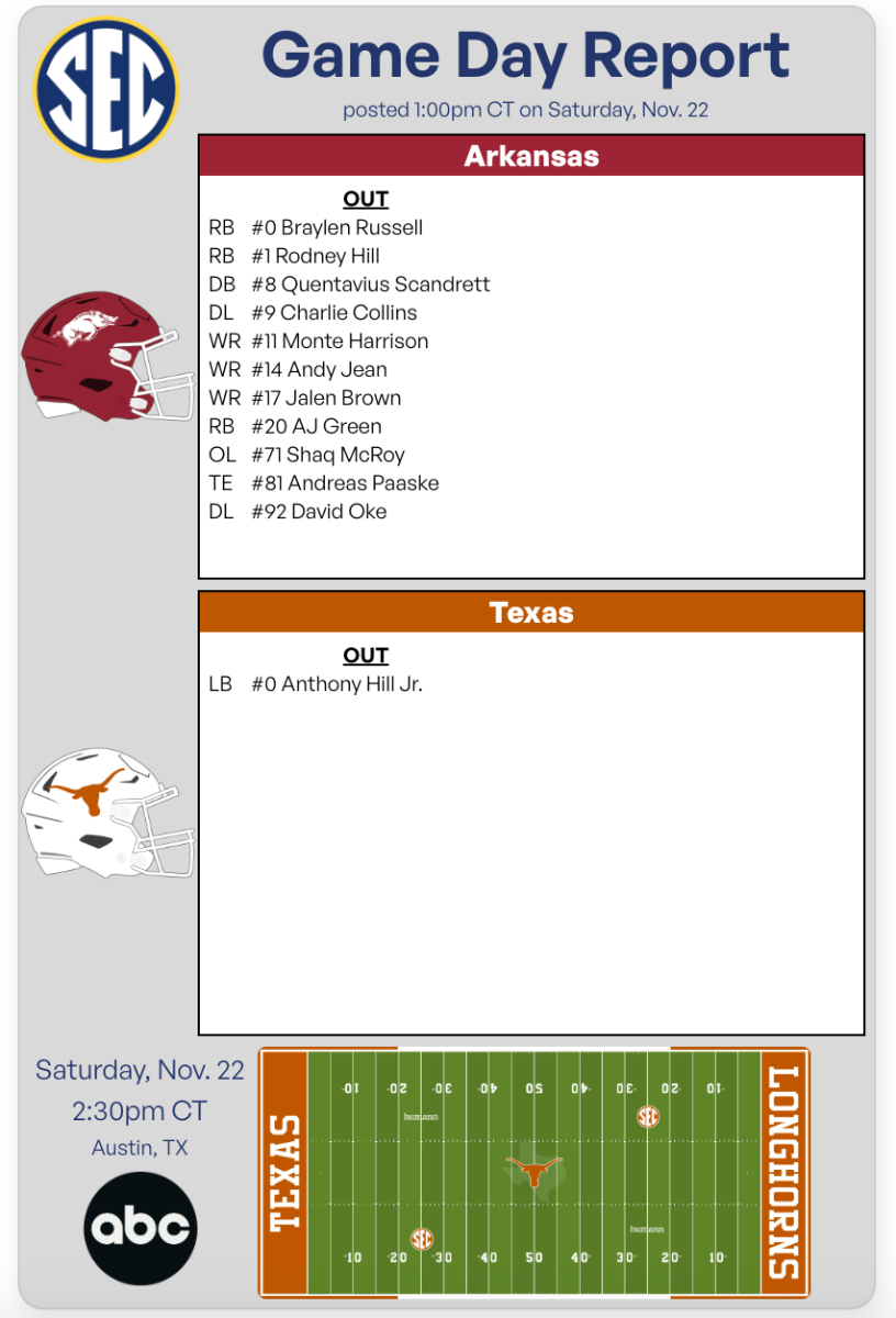 OTF Premium Friday's SEC availability report for Texas vs. Arkansas