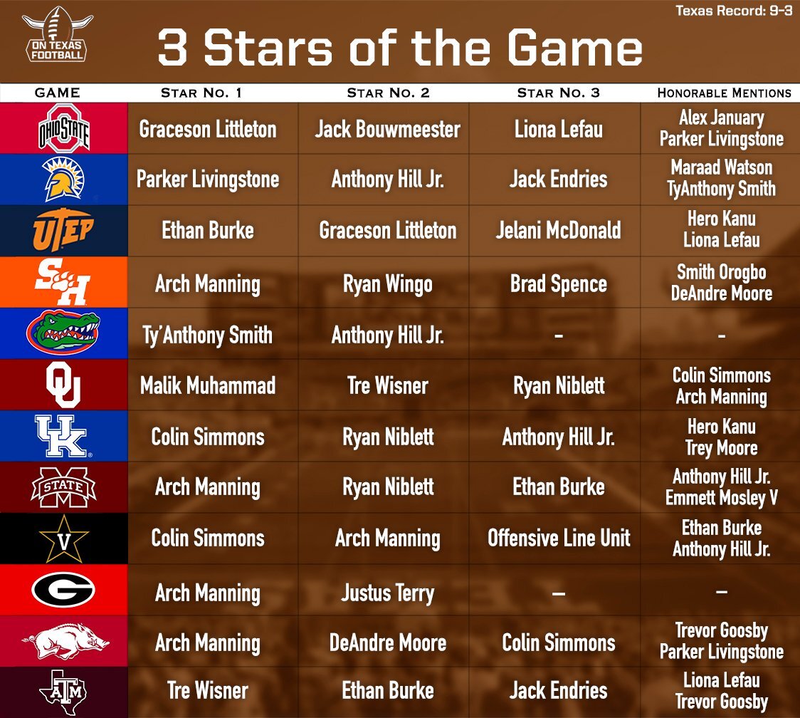 3 Stars of the Game vs. Texas A&M *** Star No. 1: Tre Wisner – Hard not to pick Wisner. For whatever the reason, he dominates against Texas A&M. A 155-yard performance on 19 rush attempts and a season-long 48-yard rush to kickoff the second half. Wisner was again very good and deserving of the game ball against Texas A&M. Star No. 2: Ethan Burke – This felt like a game early on where Ethan Burke was going to will his team to a win. The senior did just about everything and ended up blocking his second field goal attempt of the season in the first half when the offense was struggling to move the rock. Nine tackles, a TFL and a blocked field goal. Fantastic work. Star No. 3: Jack Endries – It probably has felt like a frustrating season for Endries in his first season as a Longhorn, but man did he end the regular season off strong. Four receptions for 93 yards and a massive 54-yard catch and run on the final play of the third quarter. HM1 Liona Lefau: No Anthony Hill Jr. No TyAnthony Smith for the first half, and it didn't matter. Lefau was superb for the Longhorns. HM2 Trevor Goosby: One pressure allowed on Friday night while facing one of the SEC's leading pass rushers in Cashius Howell. That was teach tape for the big time LT.