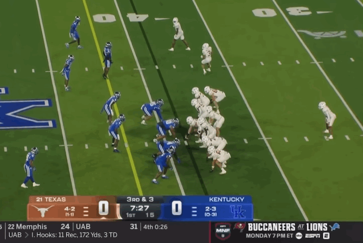 2. Trick play on 3rd & 3, Kentucky ends up with pressure after rushing 2. Texas has 7 willing blockers in the backfield. Just baffling how this happens. Nick Brooks doesn’t reach. Connor Robertson flips back while engaged and allows the free rusher.