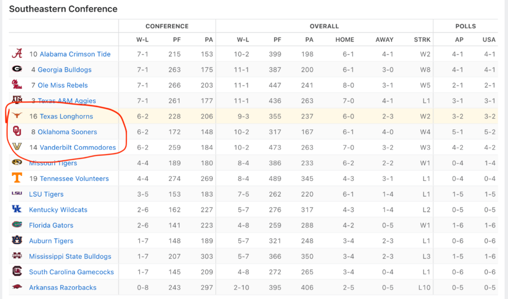 I fully expect us to only go up 1 spot on Tuesday's CFP ranking passing Michigan. It's clear the AP and committee after the third loss against Georgia had ruled Texas out of the playoffs. They will not take a 3 loss team if there are teams available with fewer. That's the only explanation at this point. Because it's only us that doesn't seem to be getting any credit for who we've beaten (this week's ranking is prime example). How can we not be above Vanderbilt beating them head to head, with a better SOS, and better wins? Just shows you their priority system is: 1st - number of losses 2nd - who you've lost to 3rd - who you've beaten 4th - head to head With 3rd and 4th potentially not even counting when it comes to Texas. -