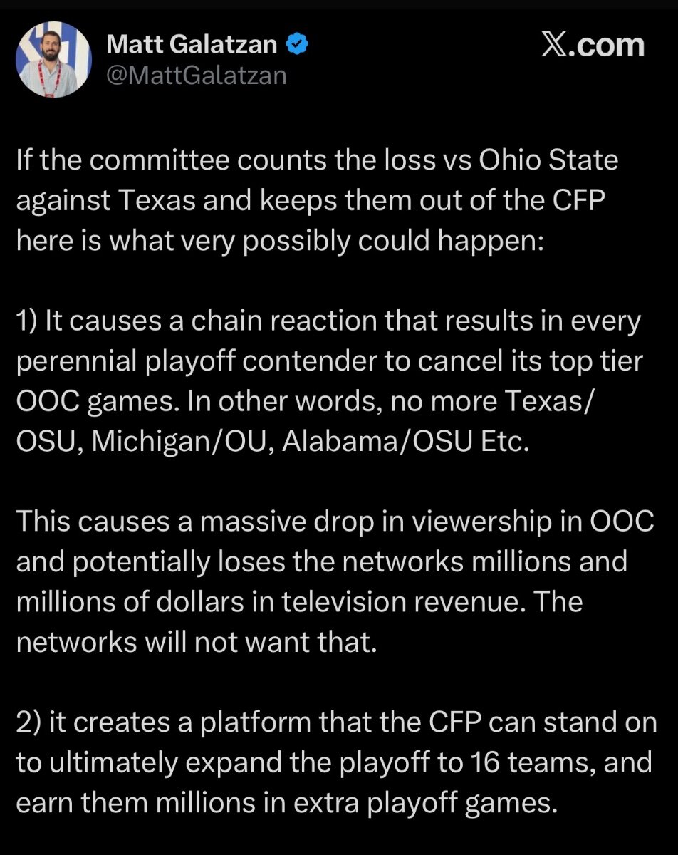 Unfortunately I think this post is accurate in how this will all play out. Networks will get the viewership/ad revenue back in an expanded playoff when tough OOC games are canceled. I guess we’re at 13 tonight. -