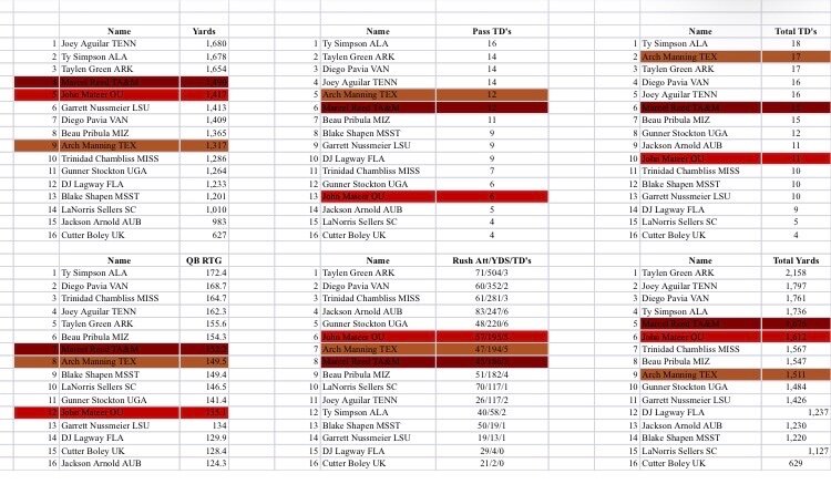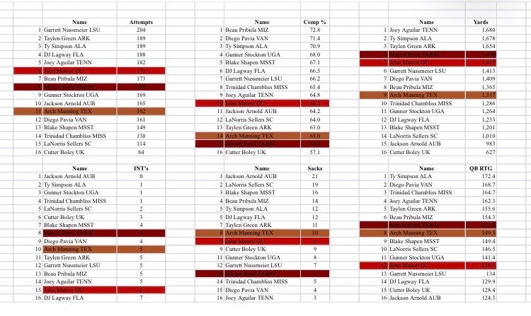 4. Speaking of the OU game and all the Mateer and Manning talk… did some work across the SEC on QB’s and as most of us know, Manning is much more closer to the middle of the pack than the basement of SEC QB’s. Texas doesn’t have a Top 30 SEC rusher or Top 20 SEC WR in terms of yards. Also, I know we can’t, but if we take out the UTEP game for Arch, he’d be tied for 4th best completion % in the SEC.