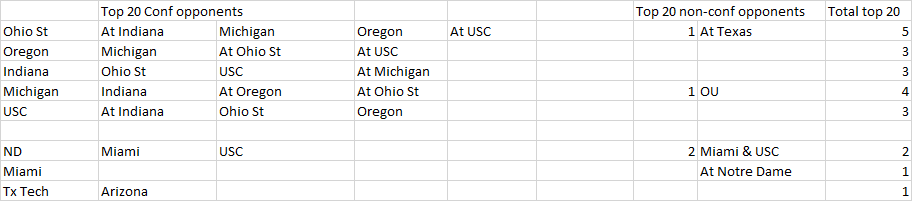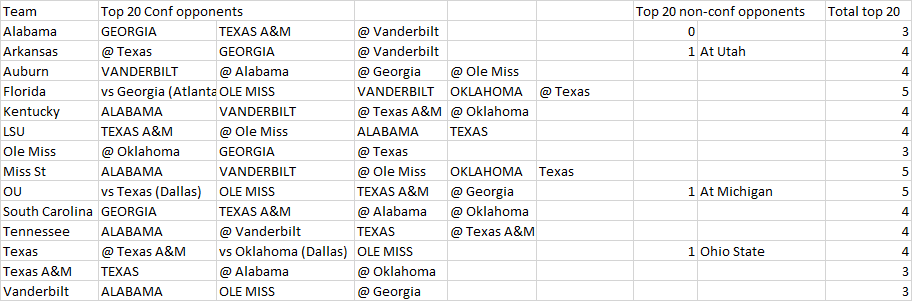 Here is a breakdown of SEC Schools and # of top 20 teams each school plays Here is Big 10, along with ND, Miami & Tx Tech. ND & Miami are pathetic and Tx Tech is an absolute joke. No Utah or BYU for Tx Tech's conference games next yr and non-conference games against Abilene Christian, At Oregon St, and Sam Houston. There is such a huge disparity in SEC/Big 10 games vs. ACC & Big 12. The SEC doesn't even include teams like LSU, Florida and Tennessee that could easily be top 20 next year based upon talent levels. Texas has to play at LSU and Tennessee next year, and both are very difficult road environments. It will be interesting to see if Ohio St were to lose to Texas on the road next year and then if they were to lose 2 other games. Will they get the Texas treatment?