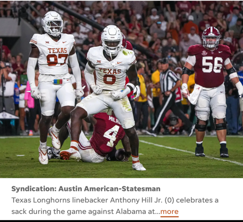 Hill Named Butkus Finalist *** Texas LB Anthony Hill Jr. has been named a finalist for the 2025 Butkus Award – presented annually to the nation's best linebackers. The finalists are as follows: Georgia LB CJ Allen Ohio State LB Arvell Reese Indiana LB Aiden Fisher Texas Tech LB Jacob Rodriguez Texas LB Anthony Hill Jr. Hill is also expected to return to the field on Friday night against Texas A&M after missing the Arkansas game with a hand injury.