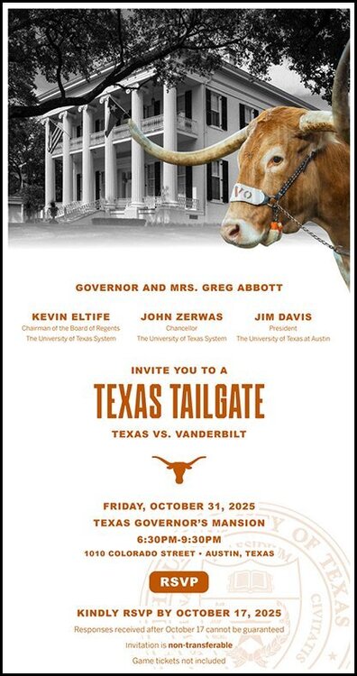 And then there's this soiree "tailgate" the night before the game, held at the Governor's Mansion and featuring the University President, the Chancellor and the Chairman of the BOR. Unfortunately I cannot make it but I'd sure like to discuss Sark's flirtation with the NFL if I could LOL