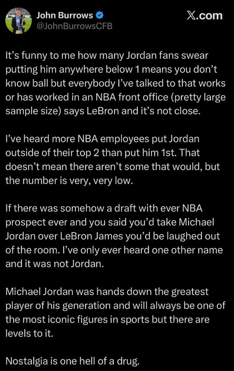 3. This tweet made me laugh out loud. “I’ve heard more NBA employees put Jordan outside of their top 2 than put him 1st.” i’m sorry but if you are talking to anyone and they have anyone other than MJ and LeBron in their top 2, you should end the conversation or at least recognize that their opinion shouldn’t be respected. Adding that in made the entire tweet just sound bitter and like a joke