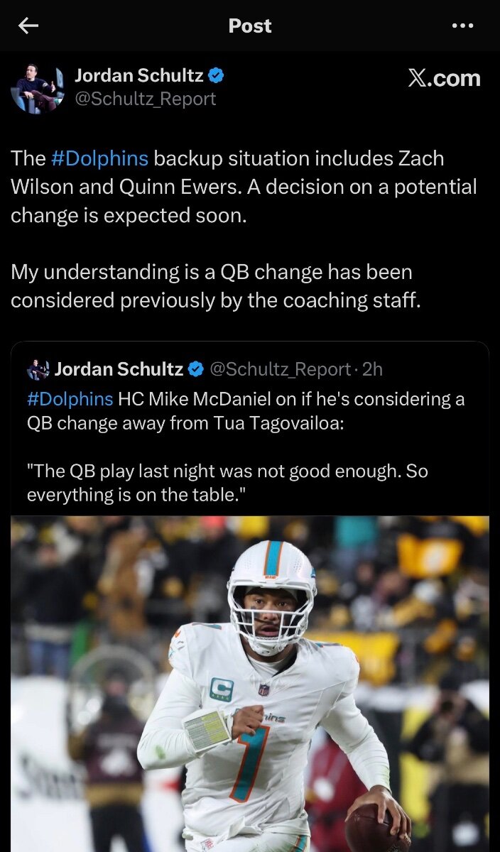 Looks like Tua could be heading to the bench. Zach Wilson is a free agent, I bet they give Quinn the nod since he is under contract to see what they have in him! 🤘 https://x.com/schultz_report/status/2001007220323242341?s=46
