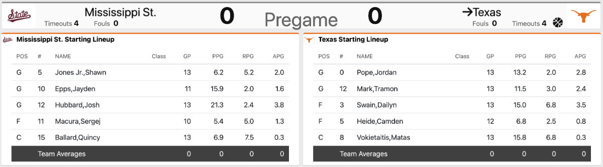 Moderators Jeff Howe Posted Saturday at 10:42 PM Moderators Posted Saturday at 10:42 PM The first SEC game of the Sean Miller era tips off at the top of the hour. Texas (9-4, 0-0 SEC) hosts Mississippi State (8-5, 0-0) at Moody Center in the first conference game for both clubs this season. A couple of notes: — There were no injuries reported on either side to the conference. The availability reports for the Longhorns and Bulldogs are clean. — I'm told the football transfer portal prospects who are visiting Texas this weekend are expected to be here at some point. — Texas is honoring the 2005-06 team that won a share of the Big 12 title and advanced to the Elite Eight. I'm told the only players on the team who aren't here are Kenton Paulino (he's an assistant coach at Wichita State), Daniel Gibson (travel issues) and Mike Williams (whereabouts unknown). 4 Quote
