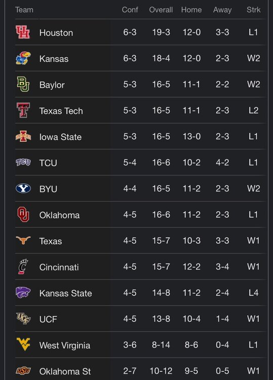 Moderators Gerry Hamilton Posted February 6, 2024 Author Moderators Posted February 6, 2024 6 hours ago, Assistant Regional Manager said: Down goes Kansas to Kansas State. Finishing .500 or above in this league should be celebrated. It’s that tough this year. Maybe doesn’t have the top end teams of years past but there is not one pushover. No question. A team under .500 in Big 12 play could very well make the Field of 68 this year. That deep of a league Quote
