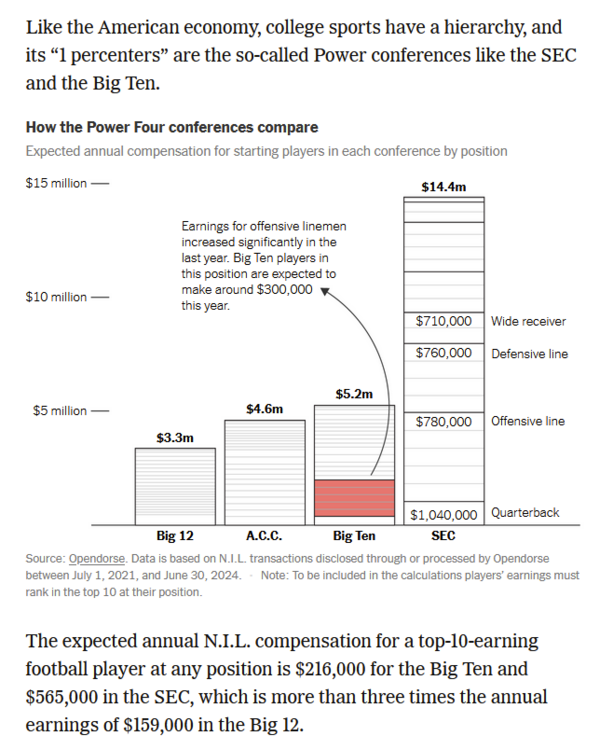 Opendorse has probably the most detailed info on this. Most of the juicy details are behind a paywall but some info leaks out. There is no requirement that all 'deals' be public, note, so they only capture a portion of the info. Here's a link to the most recent yearly summary from them (PDF file) Here are a few details about position group pay (something you asked about) and conference differences I nabbed on screenshots from an article in (I think) The Athletic last fall, as samples. This info came from Opendorse