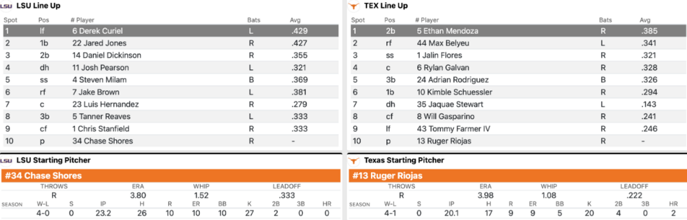 8. D1Baseball.com's boxes link to the official stats feed we get in the press box. https://d1baseball.com/scores/