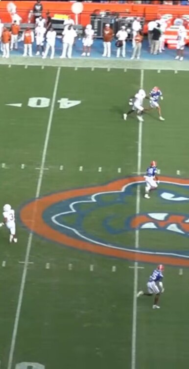 The one in which he is talking about ripping the post that ends at 3:32. The one in which the Db is over the top in prime position to break on the ball. At 7:45, he’s paused it. He’s yammering about the safety in the middle. Screenshot below. That safety is done on a well thrown ball because he and Wingo are even at the 50. He’s not running faster than Wingo and will have a greater distance to travel. Undoubtedly, the short route is the top choice, but Wingo had better leverage here than on the previous play. That safety was outside the hash to start, turns his back to Wingo as he moves to the middle of the field. So, there’s likely a justified reason for Arch’s actions. At some point, you’ve passed the point of no return with a heavy pass rush. I’m thinking rush or not he’s going deep. It’s certainly a far lower percentage throw, but no one is complaining if there’s 6 on the board. You may also have some defensive subtlety too on this particular play. Murray does mention a time or two that he’s not sure what’s discussed in meetings. I’ve heard a little about UF running cover 2. Colleges will run some different coverages and sometimes they blow it, but sometimes it’s not egregious enough to screw up but moreso add confusion to the QB. He never addresses the coverage (actually he says single high) but it looks as though we’re going deep thirds. Otherwise, there’s talk of cover 2 and 4. So, if we’re working all week on cover 2/4, then this is an unexpected variation with pretty quick pressure, that’s part of the equation. So, explain to us Murray what happens to your eyes, your reads if the defense gives you unexpected looks? Defenses have evolved a great deal in the last 10 years. Maybe that didn’t happen much. Murray clearly knows the position but seems to forget he was a 62% passer with some variation of missed reads, slow reads, pressure that caused him to miss on 38% of his balls. The context surrounding these discussions is sorely lacking. -