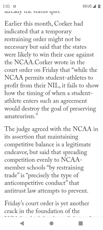 Excellent post and my point all along. Yes know it is a temporary Injunction that still could take months before it changes. The Supreme Court has signaled where this is headed in the 2021 Alston ruling. Anybody that can't see that is delusional. Plus there are other antitrust suits out there as well NIL back pay in Cali, and transfer limits. So full speed ahead to Collectives and hopefully we take full advantage. Great post to the point👍 -