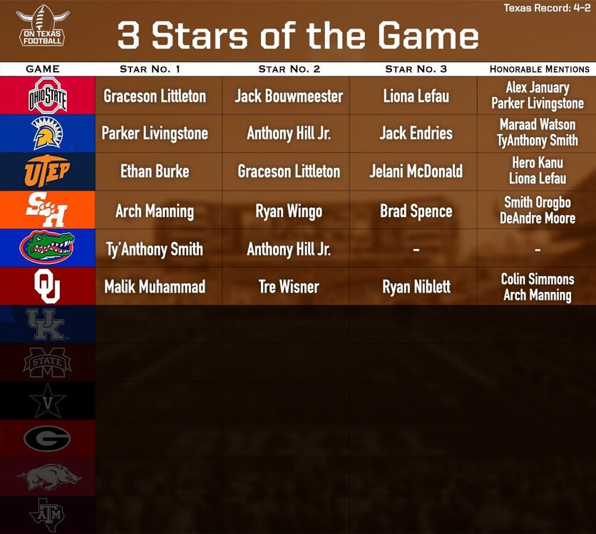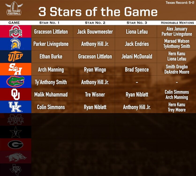 3 Stars of the Game After the 16–13 OT Win Over Kentucky *** *** Star #1 EDGE Colin Simmons Whatever has gotten into Colin Simmons over the last two weeks, sign me up for it! He has been spectacular and it has been desperately needed by the Longhorns. Simmons racked up three more sacks to his tally and took over the game at times in the 2nd half. He was a quick whistle away from a fourth sack on Cutter Boley as well. Simmons is playing like the All-World EDGE we expected, and deserves his flowers for it. Star #2 PR Ryan Niblett Perhaps the only reason Texas put points on the board on Saturday was because of the efforts of Ryan Niblett. Also, credit to the Texas punt return team for setting blocks here as well. But two straight weekends now, Ryan Niblett has grown into a star. Massive, game-changing moments helped put the Longhorns in a position to score immediate points and change the complexion of a game. Credit to Niblett, what a development this season. Star #3 LB Anthony Hill Jr. Like Simmons, Hill is really beginning to turn up the heat on the field. An interception, a team-leading 12 tackles and an additional pass break up, Hill was everywhere. One knock for Hill was obviously the fumble on the ground that he tried to scoop, rather than fall on, but hey, he was everywhere. HM1 Hero Kanu: Over 50 snaps on the interior of the defensive line, a forced fumble and a tackle for loss, quite the day on the inside. HM2 Trey Moore: It's been a rocky road for Moore over the last few weeks, but he had a great day Saturday. Moore had a 5 solo tackles, a sack and two tackles for loss while adding another QB hurry. -